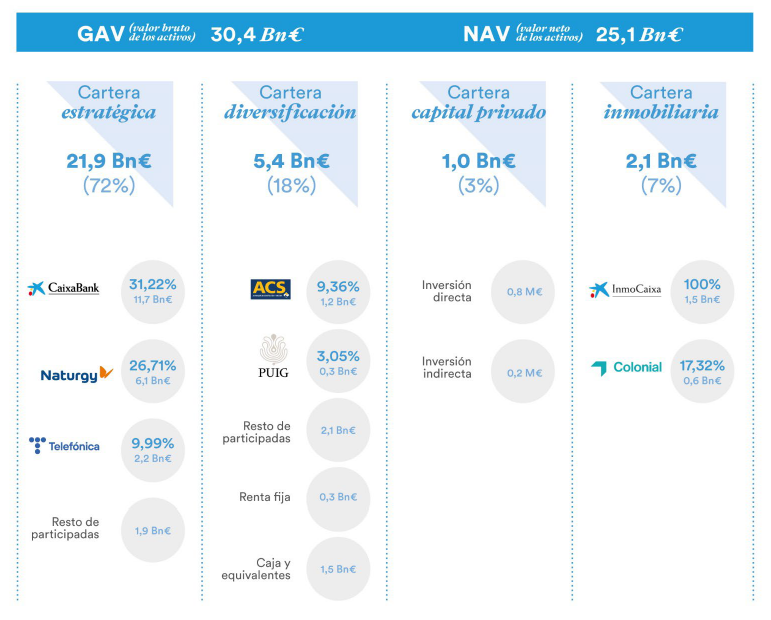 La cartera de diversificació ha pujat fins a arribar a un valor de 5.383 milions d’euros, fet que representa sobre el GAV un 18 %, que inclou actius de renda variable cotitzada, renda fixa, i la caixa i equivalents. Durant aquest 2024, ha tingut una important transformació a causa de les destacades inversions per un valor de 1.659 milions d’euros per a l’adquisició de participacions en ACS (un 9,36 %, amb una inversió de 985 milions) i Puig (3,05 % de participació, amb 425 milions invertits). Per això, s’ha revalorat la cartera de renda variable cotitzada en 218 milions d’euros, en què destaca el bon comportament d’ACS.